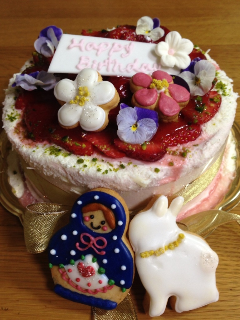 ショートケーキのホールに、お任せでアイシングクッキーをつけてもらいました。