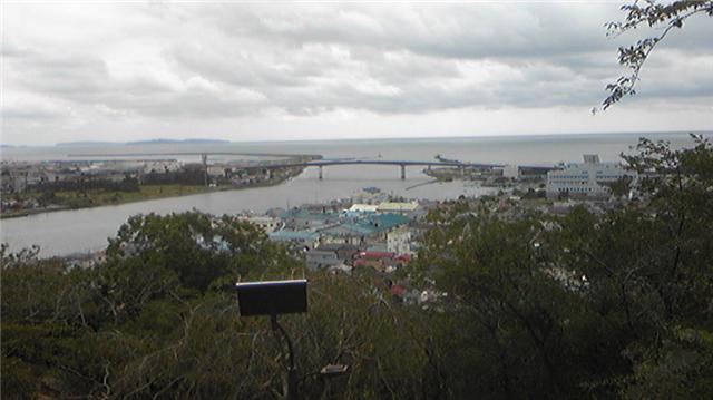 鳥居の下からパチリ 北上川と太平洋 見慣れた景色