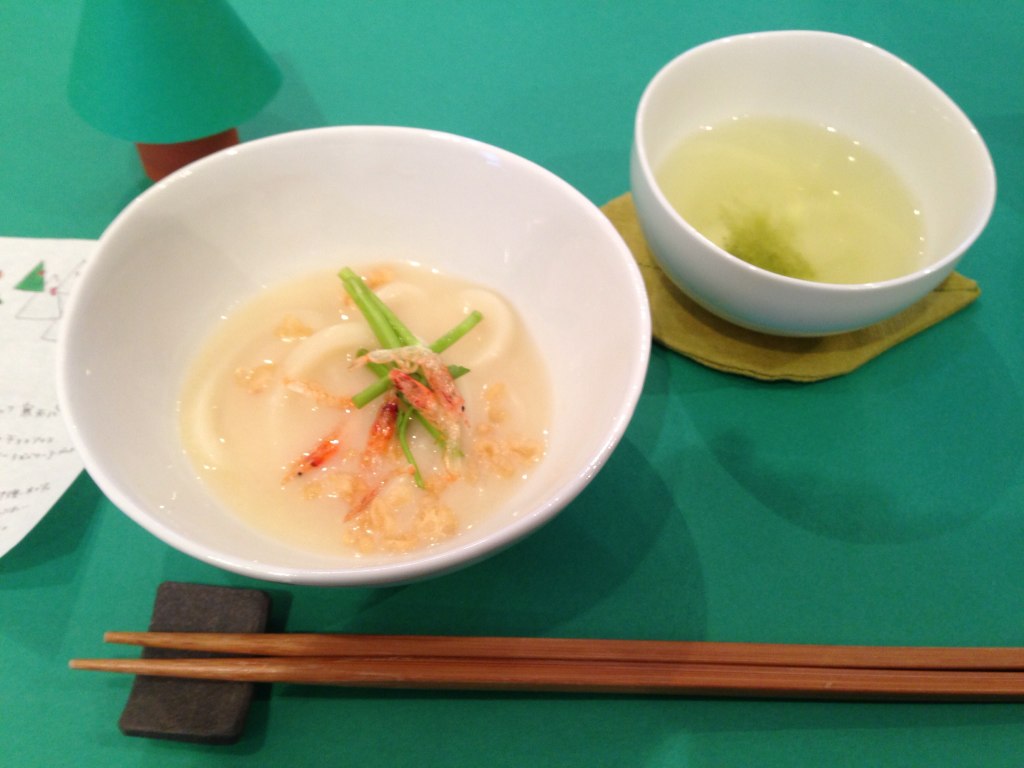 まずは、おウドンを干支の白ヘビに見たてて、お出汁と白味噌で〜